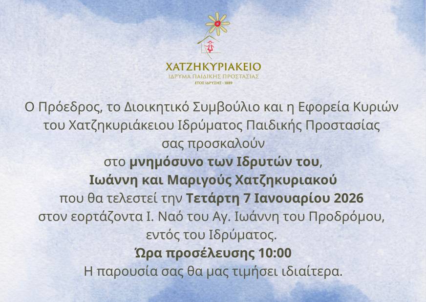 Ο Πρόεδρος του Διοικητικού Συμβουλίου του Χατζηκυριακείου Ιδρύματος κ. Δημητρίου , βάσει του καταστατικού του ιδρύματος, καλεί τα μέλη, σε Τακτική Συνεδρίαση την δεκάτη πέμπτη (15η) του μηνός Απριλίου, του έτους 2025, ημέρα Τρίτη και ώρα 14.00, στην Αίθουσα Συνεδριάσεων του Διοικητικού Συμβουλίου του Χατζηκυριακείου Ιδρύματος (Κλεισόβης 18, Πειραιάς) για την συζήτηση και λήψη αποφάσεων επί των θεμάτων της ημερήσιας διάταξης. Μέλη που δεν δύναται να παρευρεθούν με φυσική παρουσία μπορούν να συμμετέχουν διαδικτυακά μέσω σχετικού link που θα τους κοινοποιηθεί έπειτα από γνωστοποίηση στην Γραμματεία Διοικητικού Συμβουλίου ότι επιθυμούν να συμμετέχουν εξ αποστάσεως.